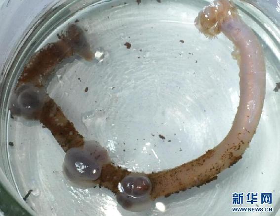 “蛟龙”号采集到的未知粉红色生物(1月14日摄)。1月14日,中国载人潜水器“蛟龙”号在西南印度洋龙旂热液区下潜,采集到一透明生物以及一只30厘米长、直径3厘米的粉红色生物,随船科学家尚不能确认它们是何种生物。张旭东摄 图片来源:新华网