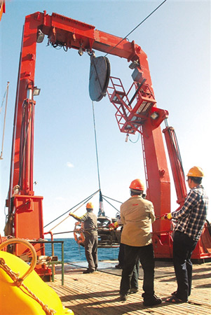 据科考人员介绍,地球是有磁场的,不同性质的岩石磁力存在差异,比如云母石磁力较弱,而含铁、钴、镍的岩石磁力较强;不同的地质构造也会带来磁力变化,比如断层造成几何形态的差异,裂隙或沟壑部位磁力就相对较弱。磁力调查就是根据磁场变化,在热液区寻找异常。 磁力调查包括航空、陆地、海洋和测井等不同形式,而海洋磁力调查又可分为海面调查和近海底磁力调查两种。本次“大洋一号”船采用的是近海底磁力调查,将磁力仪装在深海拖体中,用缆绳下放至离海底150米~200米处,拖曳其慢速前行进行调查。图为调查队员回收海底磁力仪拖体。刘 莉 摄
