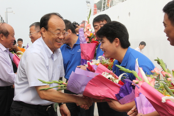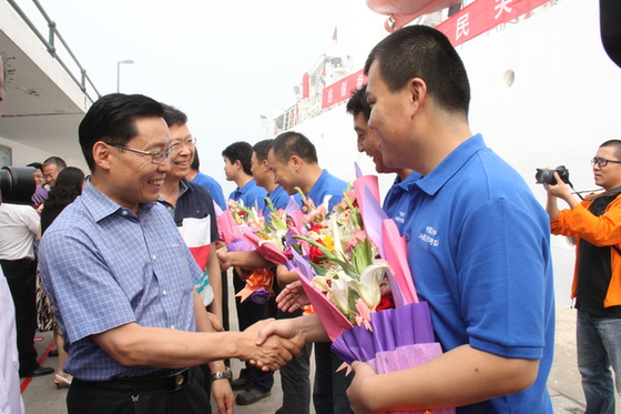 国家海洋局党组成员、副局长 中国大洋协会理事长王飞;青岛市人民政府领导;中国大洋协会办公室主任刘峰;国家海洋局办公室副主任王群,国家海洋局第二海洋研究所和国家海洋局北海分局等领导及科考队员的亲属们到场迎接并致以热情慰问。