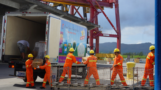 早上9点,第二批补给货品上船。从码头到甲班到厨房冷库,海洋六号全体人员排成一列做搬运接力。东西很沉,但内心的喜悦都挂在脸上。这是本次靠港以来最大也是最后一次进货。(赵凡)