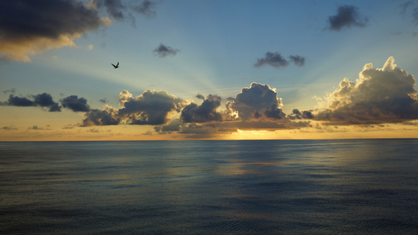 地图上的太平洋,呈比较完整的浅蓝色, 事实上的太平洋,在我们眼里,是完整的深蓝色。海上40天,除去船,放眼望,看见的就是三样东西:海水、天空和云。