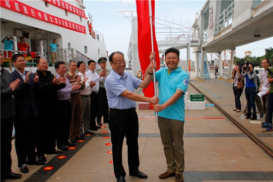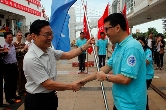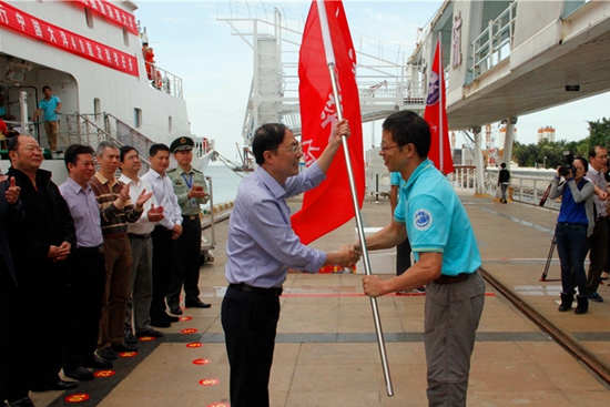 国家海洋局副局长、中国大洋协会理事长王飞为科考队员授旗。