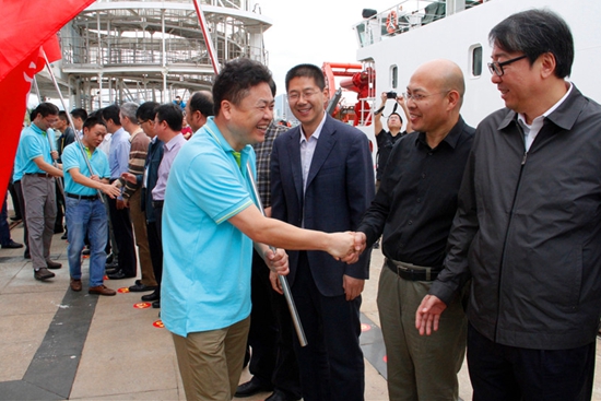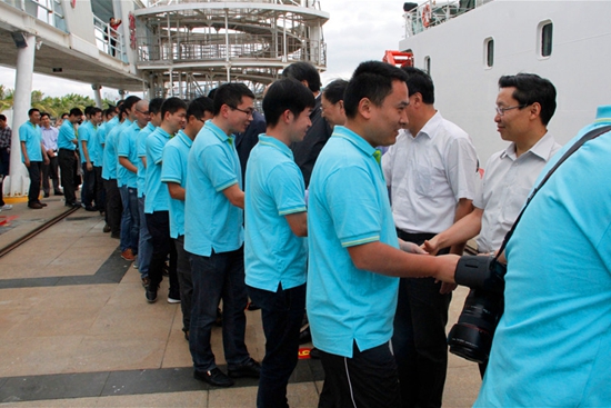 国家海洋局副局长、大洋协会理事长王飞,三亚市副市长李劲松,海洋二所所长、中国工程院院士李家彪,中国大洋协会办公室主任刘峰,中国大洋协会办公室副主任李波等为赶赴本航次西南印度洋段的全体科考队员送行。