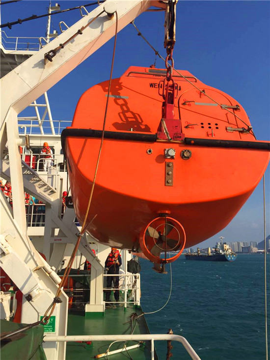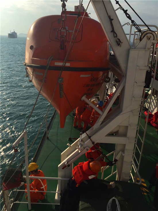 随着七短一长鸣笛警报的拉响,“向10”进入了“备战状态”。全体队员、船员迅速穿好救生衣、戴好安全帽,携带浸水保温服到艇甲板集合,列队点名,听候安排。在短暂的忙乱之后,全体科考队员及船员迅速就位、点名,秩序井然地进入到救生艇,并进行施放救生艇操作。“向10”船的船长站在驾驶台做演习总指挥,通过对讲机与船员进行指挥沟通,随着一声声“队员集结完毕”“救生艇检查完毕”等报告,有条不紊地进行安全演练指挥。