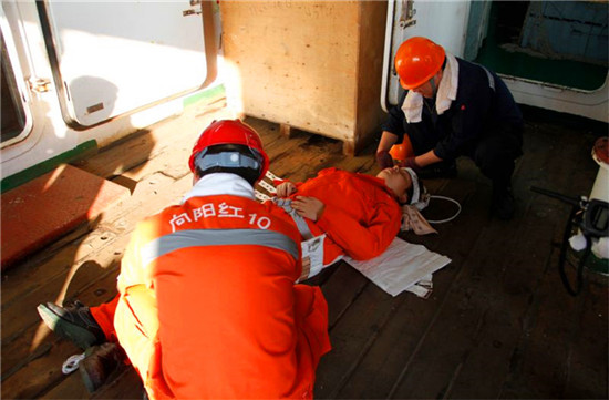 队员回到船舱后不久,乱铃加四短警报再次拉响,这一次的消防演练模拟机舱失火,有了一次演习经验的科考队员们拿着湿毛巾、戴好安全帽,鱼贯而出走到后甲板上,积极待命。船员各司其职,排除“险情”。探火员迅速进入机舱“扑灭”不大的火势。“报告轮机长,火势不大已被扑灭,未造成更大损失”,穿着消防员装备的探火员向现场指挥轮机长报告道。模拟救助伤员也同时展开,只见伤员被迅速固定在担架之上,由四名船员将其抬出,接受救援。