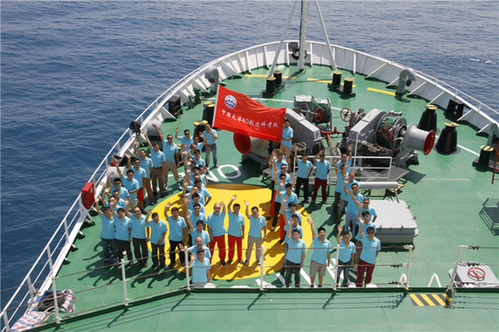 为此,大洋40航次的科考队员专门举办了一场别开生面的仪式。这场仪式由两个部分组成:拍照留念及套圈游戏。13时30分,全体科考队员及船员聚集在前甲板,紧密地站在一起,组成一个大大的“40”,大家挥手欢笑,“中国大洋40航次”的航旗映衬着每位队员的笑靥,记者用相机记录了这一永恒瞬间。