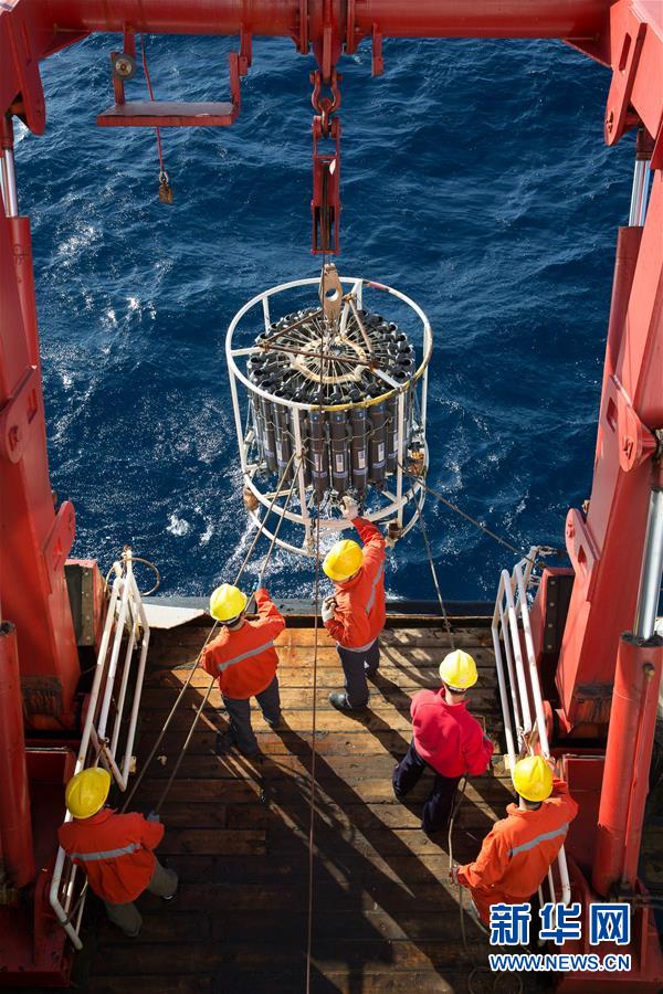 5月12日,科考队员在后甲板将CTD系统投放入水。新华社记者金立旺 摄