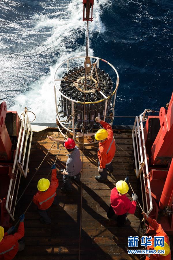 5月12日,科考队员在后甲板将CTD系统投放入水。新华社记者金立旺 摄