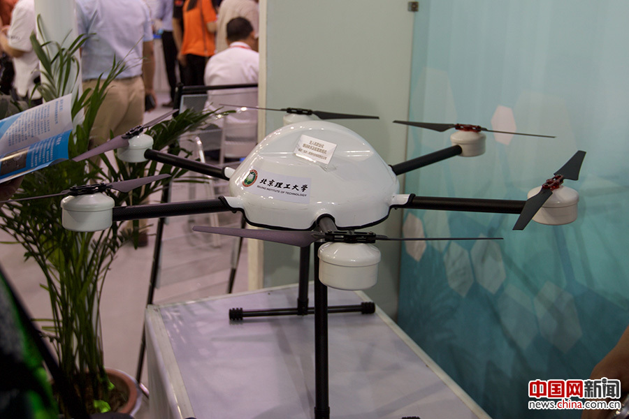2016年5月19日,北京,由北京理工大学学生自主创业研发的无人机“帝王蟹”亮相科博会。当日,第十九届中国北京国际科技产业博览会会展部分在中国国际展览中心正式开幕。中国网记者吴闻达 摄