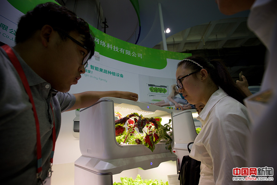 2016年5月19日,北京,巴比立方智能果蔬种植设备亮相科博会。当日,第十九届中国北京国际科技产业博览会会展部分在中国国际展览中心正式开幕。中国网记者吴闻达 摄