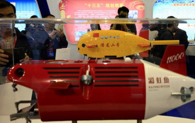 2016年中国海洋经济博览会上的万米级载人深潜器“彩虹鱼”号和自主水下机器人“潜龙二号”模型 刘诗平 摄