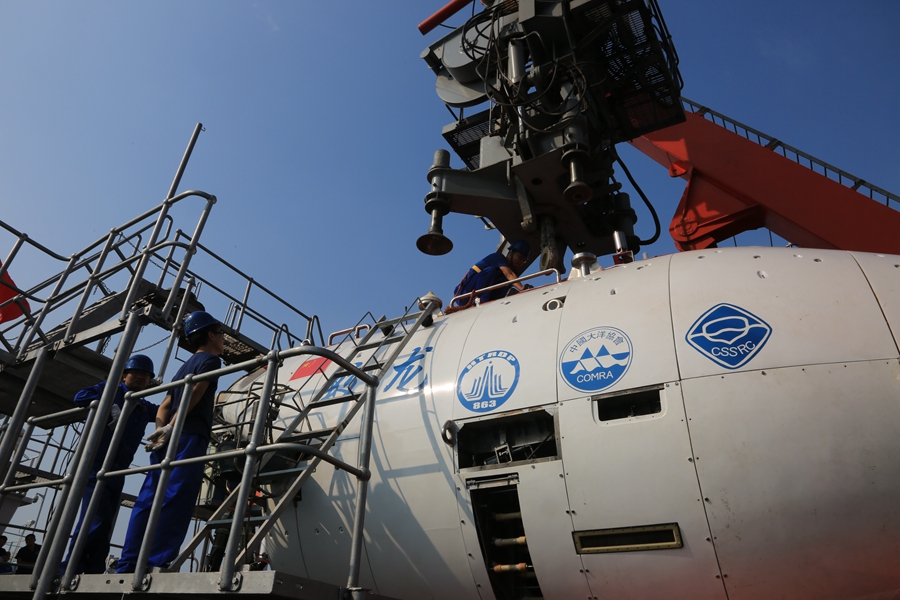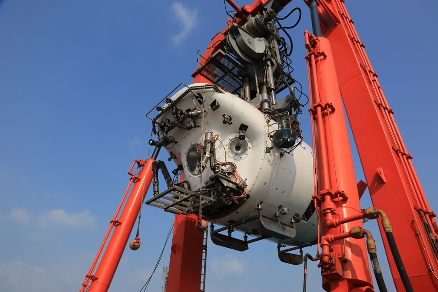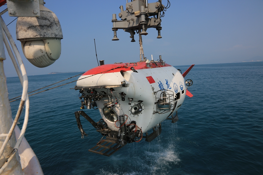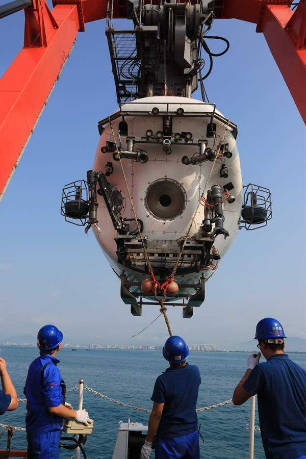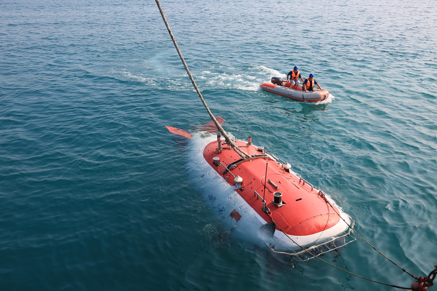 4月22日,将近期执行2017年蛟龙号试验性应用航次(中国大洋38航次)第二航段科考任务的蛟龙号载人潜水器在海南三亚锚地进行了下潜演练。
