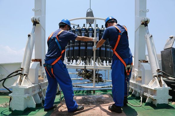 4月25日,“向阳红09”船抵达南海海域第一个海洋调查作业站位,开始了2017年蛟龙号试验性应用航次(中国大洋第38航次)第二航段首个作业站位的调查取样。