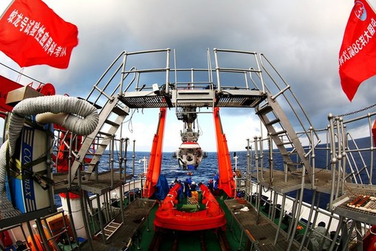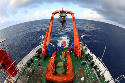 4月26日的南海,海风阵阵,涌浪使船颠簸。7时许,潜航员唐嘉陵、实习潜航员刘晓辉和杨一帆驾驶蛟龙号在南海结核采集试验选址B调查区下潜,这是本航段蛟龙号首次执行下潜作业,目标直指多金属结核。