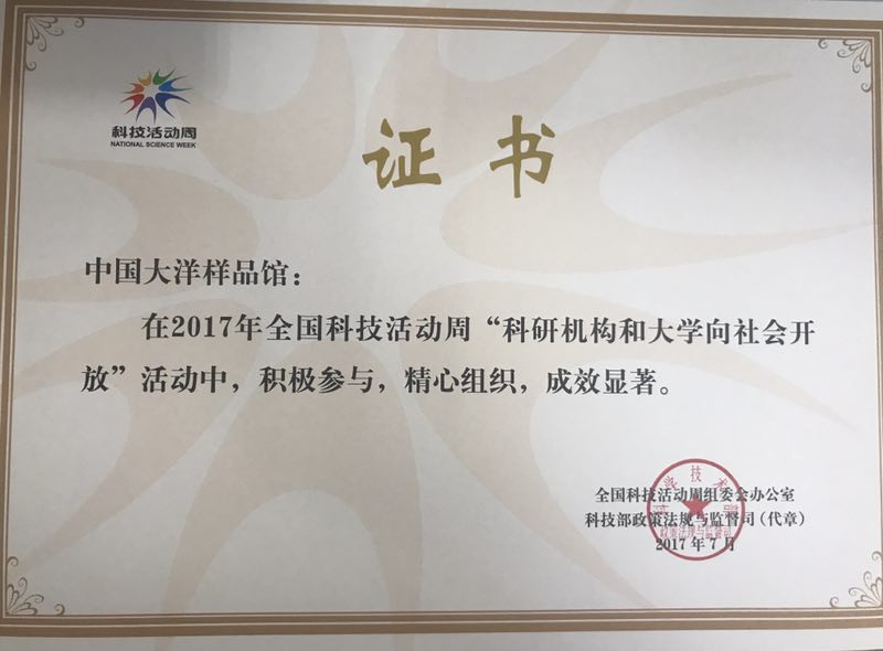 近日,全国科技周组委会办公室对在2017年全国科技周期间组织开展“科研机构和大学向社会开放”活动的单位进行表彰。中国大洋样品馆在活动中精心组织、成效显著,获得全国科技周“科研机构和大学向社会开放”活动荣誉证书。