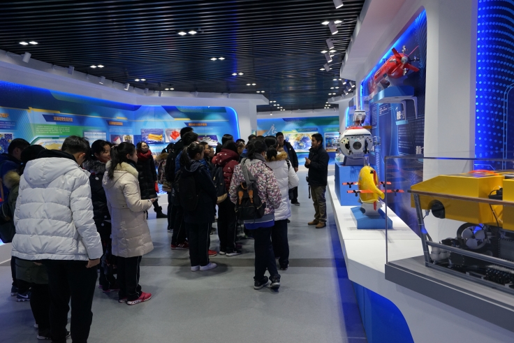 该展馆共计600多平米,由展览厅和多媒体影视厅两大部分组成,多媒体影视厅内设120度大型环幕(长11米,宽3米)用于展现丰富的海底自然资源等内容。同时,结合基地的车间、码头、科考船及1:1蛟龙号模型,构成了综合、立体的展览模式。该展馆建成后试运行阶段,已接待社会各级参观团队50余个,逾1200人次。