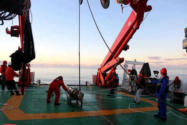 科考队正在进行重力柱取样作业