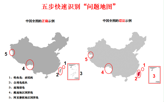 我们说的“问题地图”主要指存在危害国家主权统一、领土完整、安全和利益等严重问题的地图,“问题地图”的常见错误有漏绘钓鱼岛、赤尾屿、南海诸岛等重要岛屿,错误表示台湾省、错绘藏南地区和阿克赛钦地区国界线等。