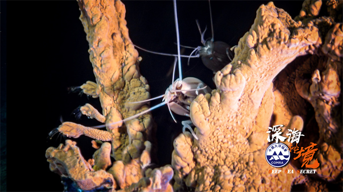 硫化物烟囱体上生活的盲虾和茗荷